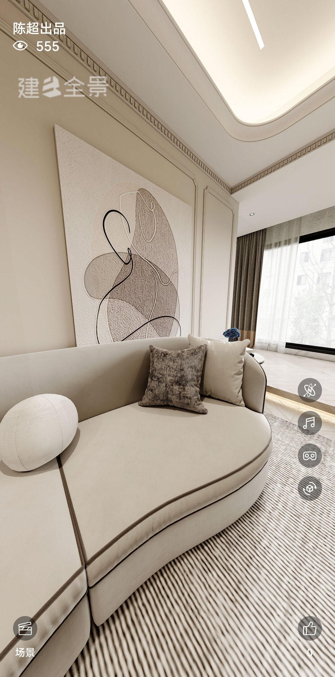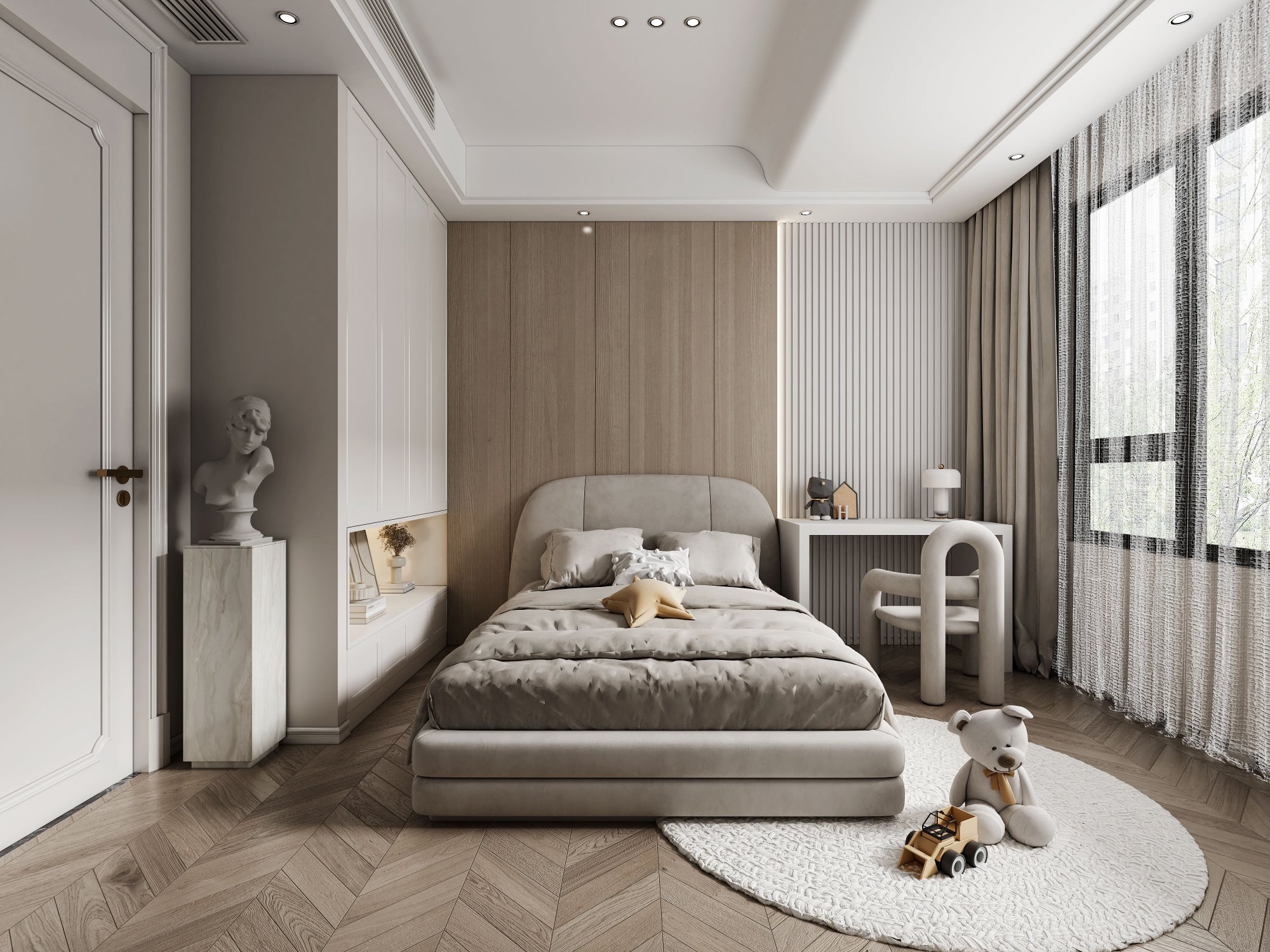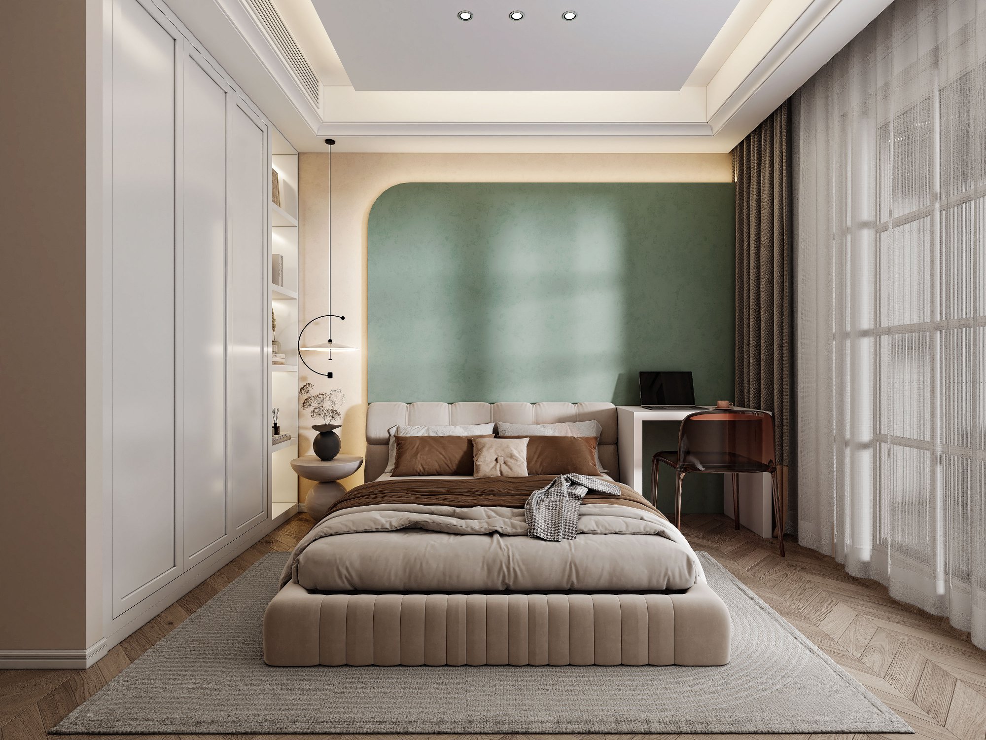 绿意与奶油色的温柔邂逅,轻盈与安稳并存,交织成家的温馨序曲。浅木色悄然融入,家的气息愈发醇厚。